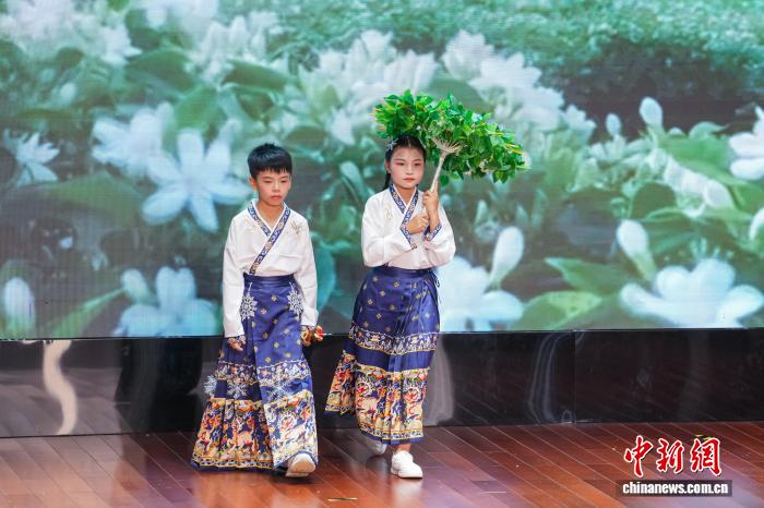 今日广西邦际壮医病院2025年“原草童止·四季健康”西医药文明入校园举动之骨气取西医药文明走秀正在北宁市5象新区第4实行小教演出。图为夏日骨气焦点浮现。中新社记者 旧冠行 摄