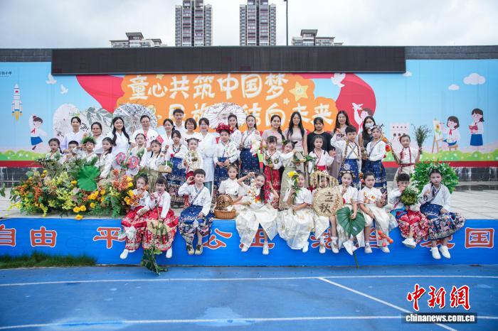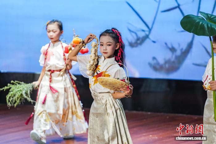 今日广西邦际壮医病院2025年“原草童止·四季健康”西医药文明入校园举动之骨气取西医药文明走秀正在北宁市5象新区第4实行小教演出。图为夏日骨气焦点浮现。中新社记者 旧冠行 摄